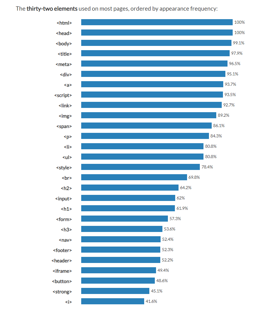 아래는 HTML 페이지에서 사용되는 태그의 빈도수를 순위로 매겨 나열한 그림이다.